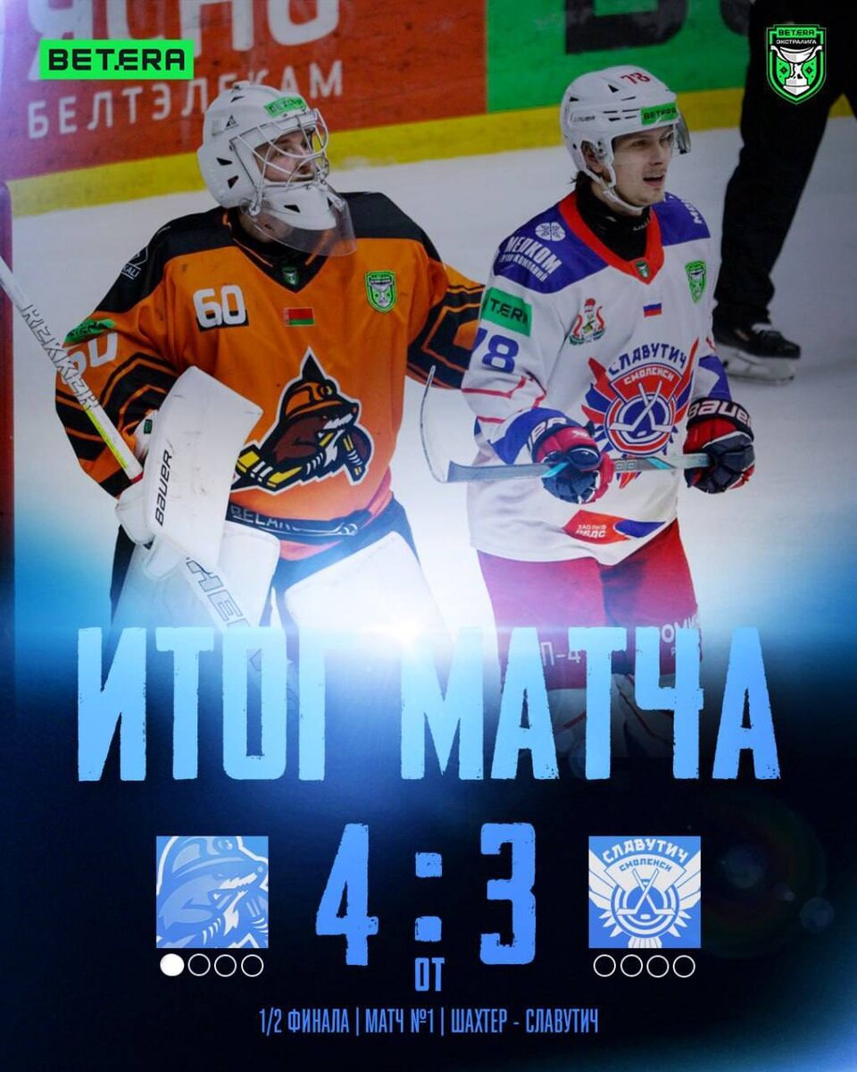 Смоленский «Славутич» неудачно стартовал в полуфинальной серии плей-офф Betera-Экстралиги. В первом матче на выезде команда уступила солигорскому «Шахтеру» со счетом 3:4 в овертайме.