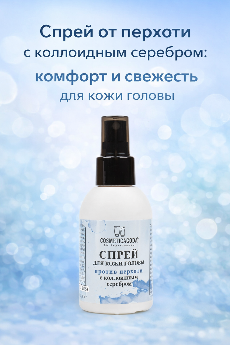 Спрей от перхоти с коллоидным серебром COSMETICAGODA — это уход для тех, кто хочет поддерживать более комфортное состояние кожи головы, ощущение свежести и более аккуратный вид волос у корней без лишней тяжести и бессмысленной возни.