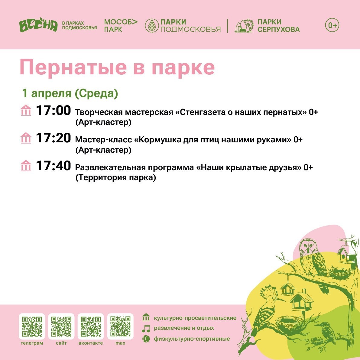 ✨ Пернатые в парке 🔹17:00 Творческая мастерская "Стенгазета о наших пернатых" 🔹17:20 Мастер-класс "Кормушка для птиц своими руками" 🔹17:40 Развлекательная программа "Наши крылатые друзья" До встречи в парке! 🚫 Возраст: 0+ 📆 01.04.2026 🕒 17:00 🏢 Парк им.Олега Степанова 📍 г. Серпухов, ул. Луначарского, д.74 💰 Вход свободный❗️ ⭐Поддержать канал голосом 💰 Канал Вакансии Серпухова ✅ Мероприятия Серпухов https://dzen.ru/id/66f01c6eb4c6fe60c9ca1608 https://vk.ru/serpukhov_events http://dzen.ru/serpukhov_events