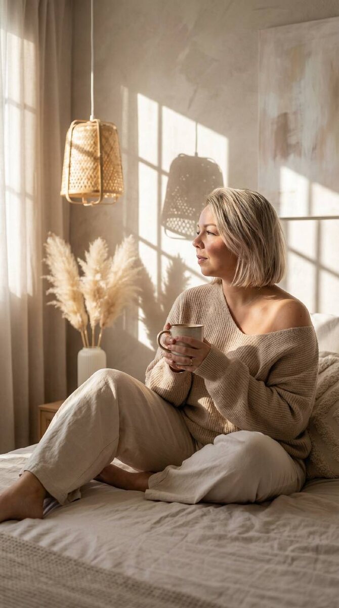 👇🏻 🌟Переходим на удобный сервис для генерации: Ссылка 👉 Syntx Ai Ссылка 👉 Veo3 📌ИНСТРУКЦИЯ ПО ИСПОЛЬЗОВАНИЮ В ЗАКРЕПЛЕННЫХ СООБЩЕНИЯХ 👍👍👍👍👍👍 ⚠️ПОДПИШИСЬ НА РЕЗЕРВНЫЕ КАНАЛЫ 👇 📱 канал в ВК 📱 канал в МАХ ◾️ПРОМПТ : Эстетичный и уютный портрет молодой женщины, сидящей в непринужденной позе на мягкой кровати в стиле бохо-шик. На ней свободный бежевый свитер оверсайз с открытыми плечами и свободные хлопковые брюки. Она держит в руках керамическую кружку и смотрит в окно. У нее такие же волосы, как на фото, короткие, но густые, с объемом у корней. Интерьер наполнен теплым светом, отбрасывающим на стену резкие геометрические тени. Декоративные элементы: плетеный абажур, ваза с пушистой пампасной травой, мягкие подушки и абстрактная картина на заднем плане. Успокаивающая, умиротворяющая атмосфера в стиле хюгге, мягкий фокус, кинематографическое освещение, высокая детализация, 8K.