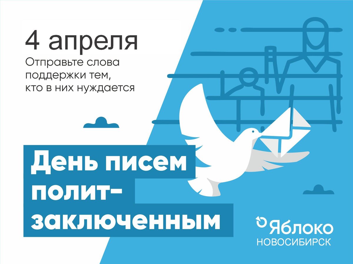 4 апреля, суббота, с 16:00 до 19:00 ч. Красный проспект, 39, оф. 403 (теперь на четвертом этаже!). Количество россиян, лишенных свободы по политическим мотивам, растет каждый месяц. Сегодня таких — более тысячи тысяч человек. 🤝 Наша задача - поддержать этих людей в прохождении тяжкого испытания, проявить солидарность и теплые чувства. Ваши письма помогут тем, кто лишен свободы за свое инакомыслие и публичную мирную позицию. ☮️ Присоединяйтесь!