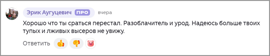 Итак, последний день марта и время подвести итоги за уходящий месяц. Скажу честно, я надеялся, что и в марте (так же, как и в феврале) не придётся никого банить. Однако надежды не оправдались – буквально вчера появился такой коммент: Печально, но увы и ах – без бана не обойтись. И это при том, что в марте на канале не было публикаций, общие просмотры ко всем прежним статьям совсем чутельные – не более пяти в день. И при такой статистике всё же нашёлся кандидат в бан. На момент публикации статьи Эрик Аугуцевич является единственным кандидатом в бан за оскорбление автора. Отныне ему закрыт доступ к комментированию до 30-го апреля. Пару слов относительно аватарки Эрика Аугуцевича. В принципе, каждый пользователь волен использовать в качестве аватарки то изображение, которое посчитает нужным. Правда, тут может вступить в конфликт авторское право, однако данный аспект мы рассматривать не будем. Дело тут не в нарушении авторских прав и не в аватарке как таковой. И даже не в Эрике Аугуцевиче.