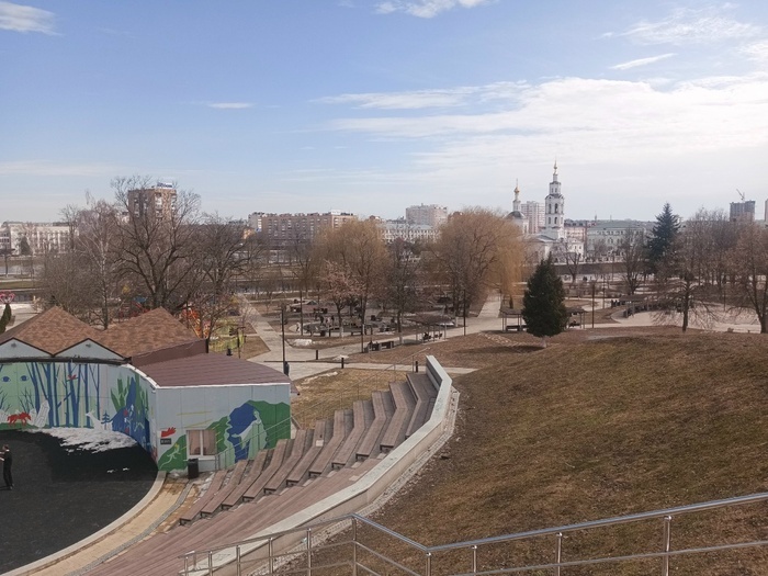 Поднимаясь по почтовому переулку в сторону пепельницы, вам откроются не только виды. Здесь можно услышать волшебную музыку, но непонятно сразу, откуда она., но потом вспоминаешь, что играют её на музыкальном инструменте - большом ксилофоне. Таких развлечений в детском парке два, но на одном уже молоточек оторвали, видимо кому-то дуэт чей-то не понравился. А виды здесь, правда шикарные, зелени еще нет и можно обратить внимание на детали. Выделяется храм Богоявленский. На фоне стандартных многоэтажек он, как буд-то игрушечный. Слева, если взять бинокль, можно рассмотреть моржиков. У них пляжный сезон в самом разгаре. Это ребята 70+, но бодренькие, с легким юморком и в одних плавках. Песни «Вечно молодой» и «Молодость жива» это про них. Но сейчас пляж подтопило, вода в реках заметно прибавляется. Ух, набережная, держись, будет тебе проверка на прочность! Велосипедистов тоже заметно прибавилось, причем у каждого свой стиль: от семейных покатушек, до дяденьки на старой «Десне». Спереди у не