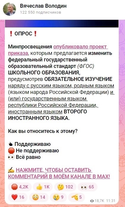 На эту тему спикер проводил опрос в своем канале в "МАХ".