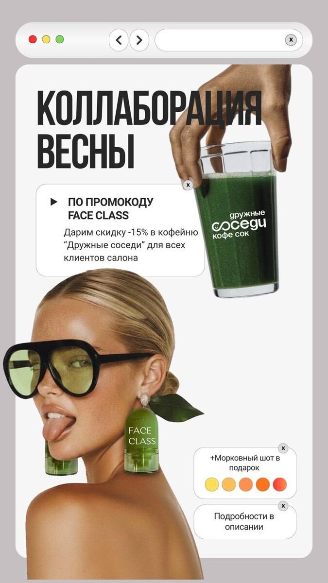 Поэтому мы решили сделать коллаборацию с теми, кто разделяет наши ценности. Мы подружились с уютнейшей кофейней «Дружные соседи» 🧃 Для тех, кто следит за своим здоровым образом жизни, здесь настоящий рай. В меню эксклюзивные авторские напитки, полезные смузи и свежевыжатые соки, богатые витаминами. Это про сияние кожи, здоровые волосы и ногти, поддержку иммунитета. Идеальное место, чтобы продолжить заботу о себе после салона: выпить витаминный смузи в уютной атмосфере и устроить маленький релакс 🎁 А теперь о приятном для вас: Мы дарим нашим гостям скидку 15% на всё меню напитков кофейни «Дружные соседи» + морковный шот в подарок! Чтобы получить скидку, просто: 1. Подпишитесь на ТГ каналы "Face Class" и "Дружные соседи" 2. Приходите в кофейню "Дружные соседи" 3. Покажите этот пост на кассе (или назовите промокод FACE CLASS) и наслаждайтесь вкуснейшими здоровыми напитками со скидкой! ⚪️ ТГ "ДРУЖНЫЕ СОСЕДИ" 📍Адрес: Шелепихинская наб., 34к2зд1