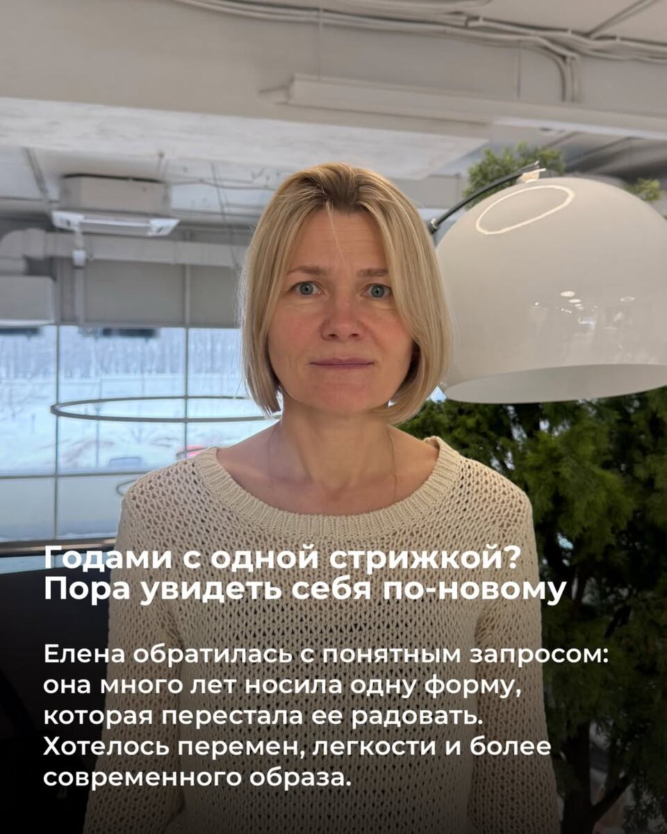 Елена пришла к нам с запросом, с которым, как нам кажется, сталкиваются многие – хочется перемен, а еще надоело укладывать волосы☺️ С этого все и началось. Долгое время с одной и той же формой: средняя длина, удлиненная челка. Но самое главное, достаточно тяжелые волосы, которые из-за этого живут по своим правилам. На консультации Елена поделилась, что каждый раз приходится прилагать максимум усилий, чтобы придать прическе объем. В том, чтобы не пытаться сопротивляться волосам, а подобрать ту форму, которая будет облегчать вопрос с ежедневной укладкой. Когда волосы плотные и тяжелые: При этом можно купить хоть 10 средств или сушить волосы головой вниз, если форма не работает – то скорее всего весь эффект от укладки будет очень недолгим. Наш топ-стилист Галина Изварина не стала усложнять и предложила стрижку бикси. Красивый и современный вариант, который хорошо перераспределяет объем и добавляет стиля. Если очень долго ходить с прической в среднем диапазоне длины, то может возникнуть ло