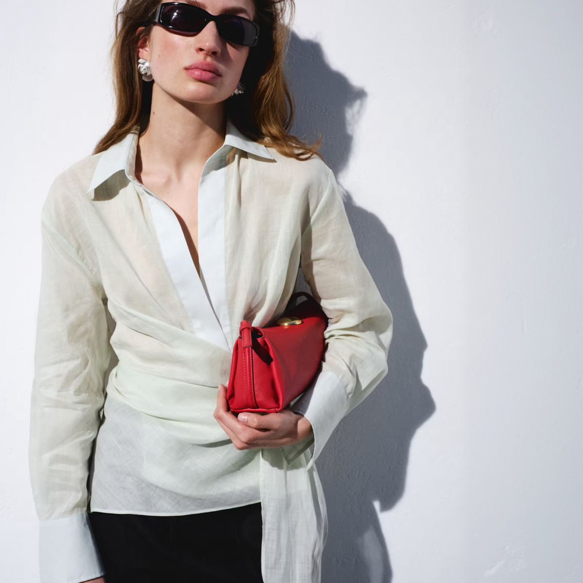 4. По материалам отдельно выделяется атлас. Атласные сумки всё чаще появляются в дневных образах, особенно в сложных оттенках вроде хаки или приглушённого зелёного. Параллельно усиливается тренд на «мягкие» конструкции — сумки-мешки, модели на узлах, драпировки и сборки.