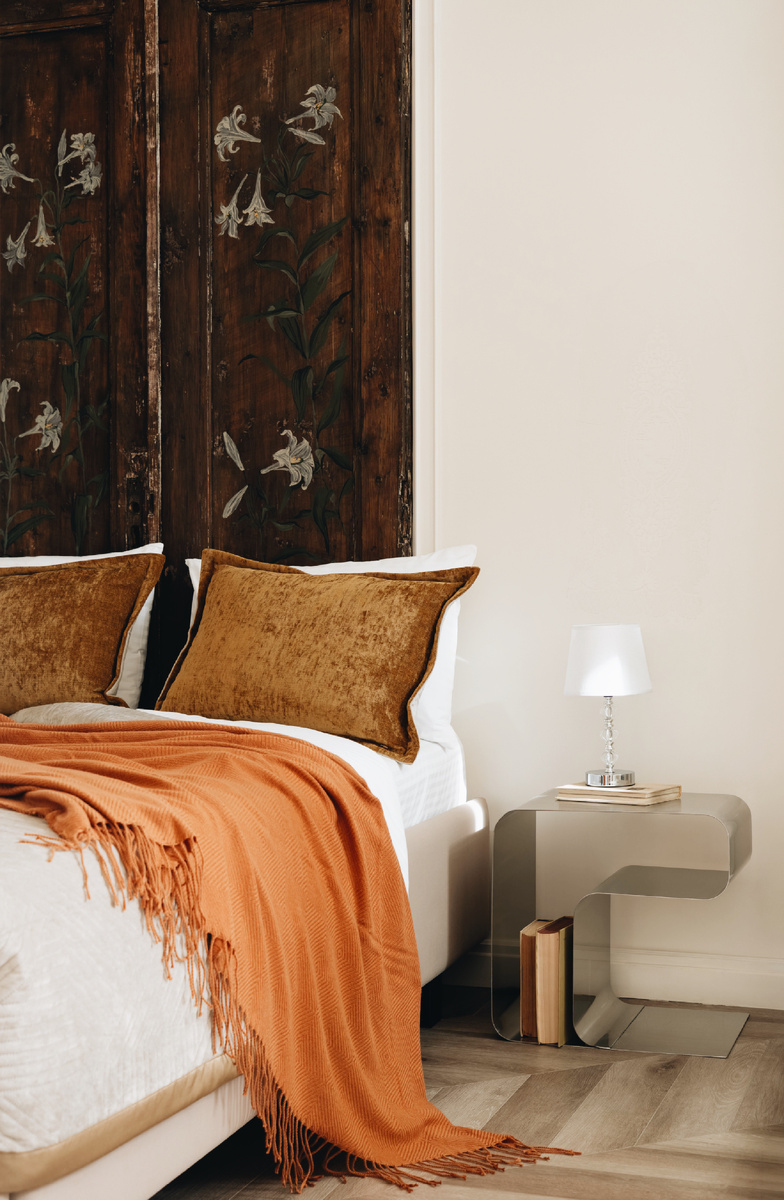 Эта спальня — про тактильность, тепло и характер. В центре композиции — ИЗГОЛОВЬЕ, созданное из старинных дверей НАЧАЛА 20века с деликатной ручной росписью 🍃