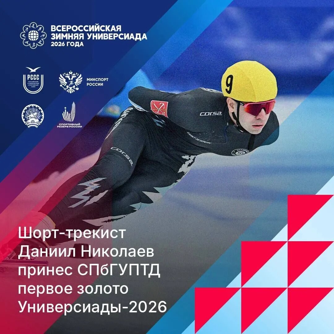 IX Всероссийская зимняя Универсиада прошла в Уфе. В решающем забеге по шорт-треку на дистанции 1000 м среди юниоров студент СПбГУПТД Даниил Николаев занял первое место. На финише он опередил соперника на 0,414 секунды. Время победного заезда обучающегося составило 1:34:860. По итогам медального зачета СПбГУПТД вошел в топ-10.