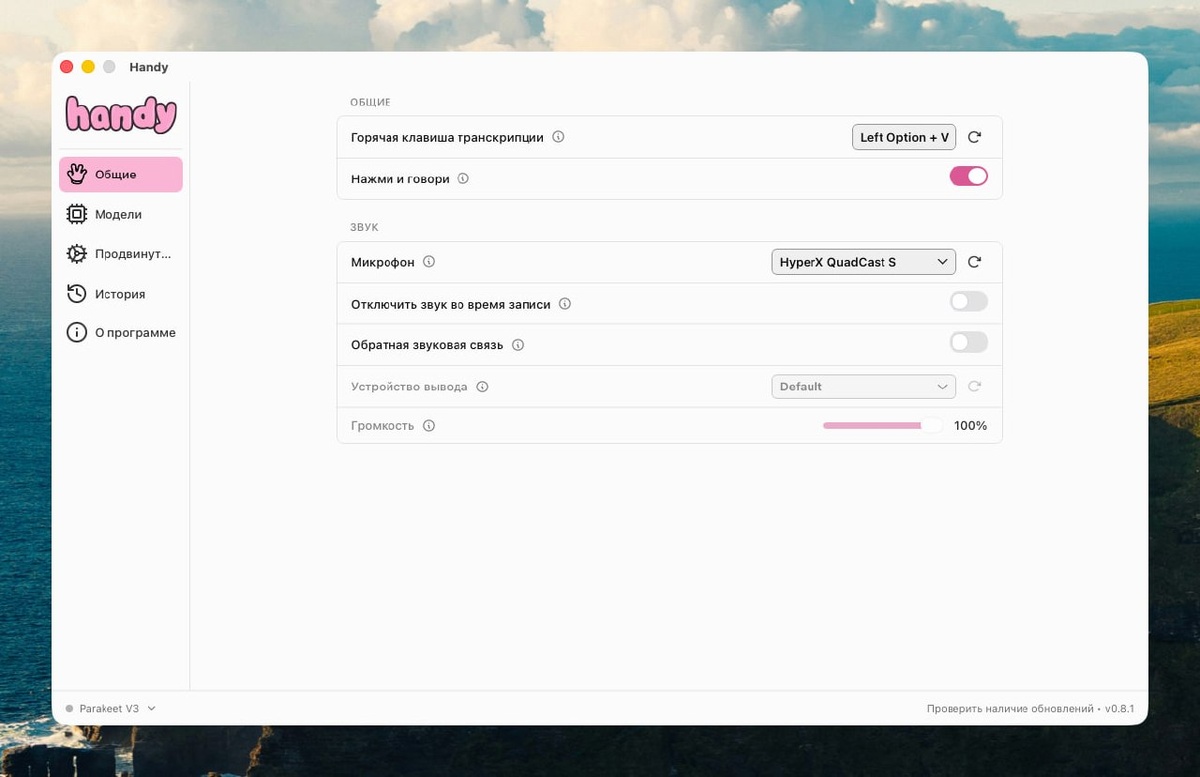 д. Сколько раз у вас бывало: сидишь, работаешь, и тут в голову прилетает гениальная мысль. Пока переключаешь окна и открываешь инбокс, мысль делает ручкой благополучно растворяется. Встроенные диктовалки ОС часто тупят, а наговаривать голосовухи в Telegram и потом перегонять их ботами в текст - выглядит как костыль. ТАкого рода софта на рынке уже довольно много - это VoiceInk, MacWhisper, Heynds и т.д. Все перечисленное объединяет неприятная особенность. Платность. На днях наткнулся на утилиту Handy (handy.computer). По сути, это маленькая бесплатная софтина, которая делает ровно то же самое, что и платные аналоги: переводит ваш голос в текст и вставляет его абсолютно в любое текстовое поле. И делает это просто отлично. В чем киллер-фичи: 1️⃣ Глобальный хоткей: Настроили шорткат, зажали кнопку (как рацию) - говорите. Отпустили - текст моментально вставился туда, где стоит курсор. Будь то ваша заметка в Obsidian, поисковая строка браузера или мессенджер (или вообще терминал). 2️⃣ По