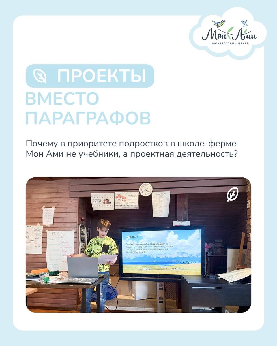 От родителей, кто нас еще не знает мы часто слышим вопрос: «Как подростки получают знания, необходимые для поступления в ВУЗы?» И сегодня этот пост - как раз об этом. О том, почему в Монтессори мы делаем ставку на проекты, фермы и реальный опыт. Почему для нас важно, чтобы ребёнок не просто знал, а понимал. Не повторял, а проживал. Потому что знания, к которым ребёнок приходит сам, остаются с ним гораздо дольше, чем всё, что можно просто прочитать и забыть. Потому что важно в процессе обучения учитывать особенности возраста от 12 до 18 лет. Познакомиться с нашей загородной резиденцией-фермой можно 📒 19 апреля с 12:00 до 16:00 📍пос. Зеленая роща, 20 Запись на день открытых дверей Ждем вас всей семьей!