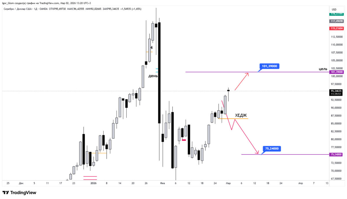 2 марта я опубликовал отчёт по серебру (XAG/USD) для частного клиента. В нём были указаны два сценария: Основной (вероятность 65–70%): Альтернативный (хедж, вероятность 30–35%): Что произошло на самом деле: 3 марта — цена пробила 86.56 вниз. Сработал хедж.