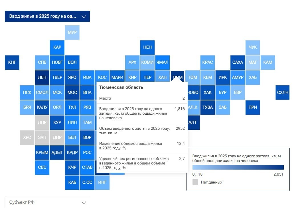 Тюменская область вошла в топ-2 по вводу жилья в стране.
