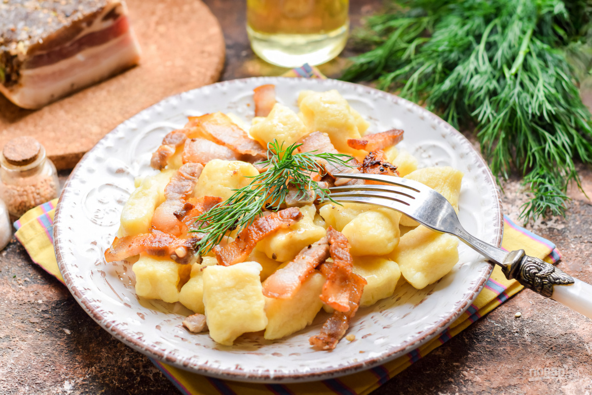 Финальная сборка блюда Переложите варёные клецки на сковороду к бекону и сухарям. Аккуратно перемешайте, чтобы все ингредиенты равномерно соединились. При желании посыпьте блюдо свежей зеленью перед подачей.
