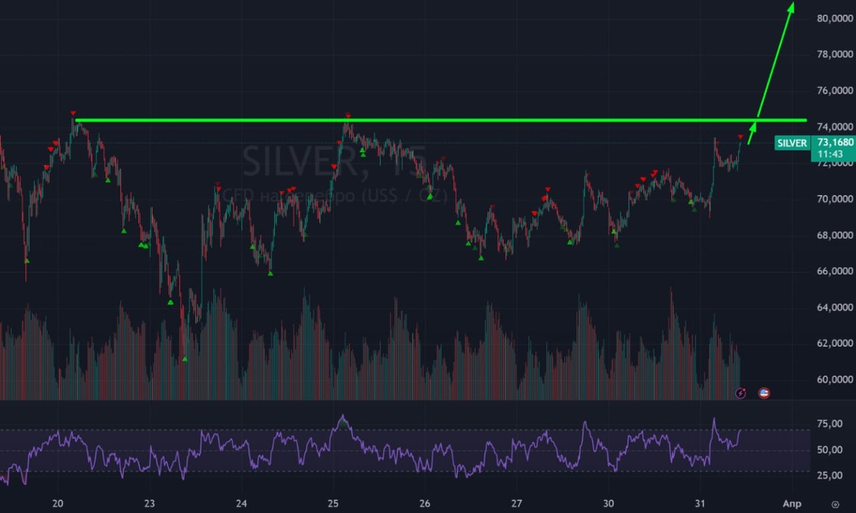 🥈 Серебро 🟢 на 15-минутном тайм-фрейме видно, что подходим к ближайшему сильному сопротивлению, от которого отбивались дважды. Это уровень 74.40. Сможем ли пробить в этот раз? Я надеюсь, что да. Есть высокая вероятность развернуться после волны МК, которые были 23го марта. 🚗 Жду серебро вверх! пробой 74,40, а среднесрочно на перехай. #серебро #silv #silver #svh6 #bogdanoffinvest $svm6 $s1m6 $svu6 $s1u6 $s1z6 $svz6