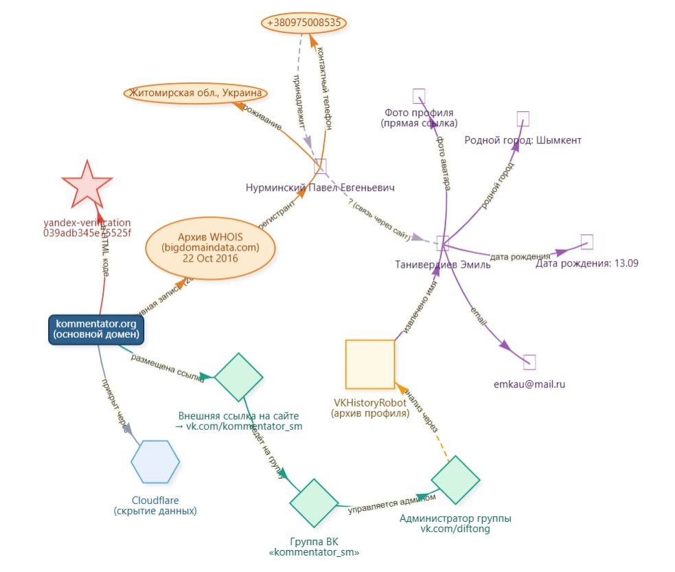 org. Оказалось, что ресурс разместил интервью, которого я никогда не давал. Во-первых, я не комментатор для noname-изданий. Во-вторых, авторы даже не потрудились подделать мою лексику и семантику. Но этот случай — отличный кейс, чтобы показать, как в OSINT происходит идентификация лиц, причастных к владению и администрированию веб-сайтов, даже если данные скрыты. Поехали по шагам. 1⃣ Кто прячется за WHOIS? Первым делом бьем по домену kommentator.org. Регистрация: 22 September 2013. Актуальные данные: Прикрыты CLOUDFLARE — глухо, стандартная история. Смотрим архивные снимки WHOIS. Используем базы вроде bigdomaindata.com. Смотрим архив от 22 Oct 2016 — и вот он, «скелет в шкафу»: Name: Nurminskii Pavel Evgenevich State: Zhitomirskaya obl Phone: +380975008535 Человек из Житомирской области. Уже есть зацепка. Использованные сервисы: https://www.virustotal.com/, https://dnsdumpster.com/, https://www.bigdomaindata.com/, https://web-check.xyz/ 2⃣ Выход на социальные сети. Идем на сайт. Нахо