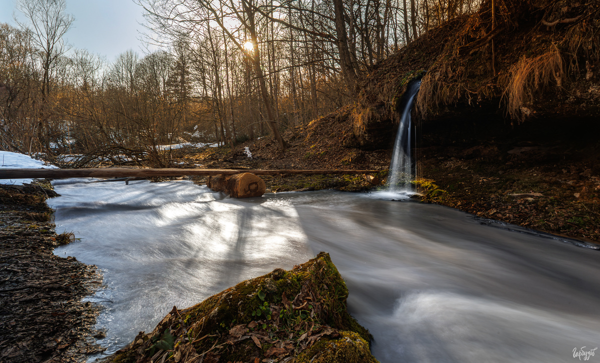 В средней полосе водопады — явление редкое. Да и «водопадами» их чаще называют условно. Обычно это ручьи, которые на своём пути срываются с небольших обрывов или порогов. Летом многие из них пересыхают, и от всей этой «красоты» остаётся лишь влажный склон. Поэтому единственный шанс увидеть наши водопады и снять их так, чтобы хоть немного напоминали настоящие — это время весеннего паводка. Ершовский водопад в Калужской области — как раз из таких мест. Он не пересыхает, но летом превращается в совсем небольшой ручеёк. А вот весной, когда сходит снег, воды становится достаточно, чтобы водопад выглядел уже вполне «по-настоящему». Расположен водопад на краю деревни Ершово. Добраться до него просто: нужно проехать деревню насквозь и спуститься в овражек по натоптанной тропинке. Координаты: 54.858300, 37.103399. Солнце уже низкое, но тёплое: цепляется за стволы и вытягивает длинные тени через ручей. Вода после паводка мутная, тяжёлая, идёт ровным потоком, без летней прозрачности. Небольшой ус