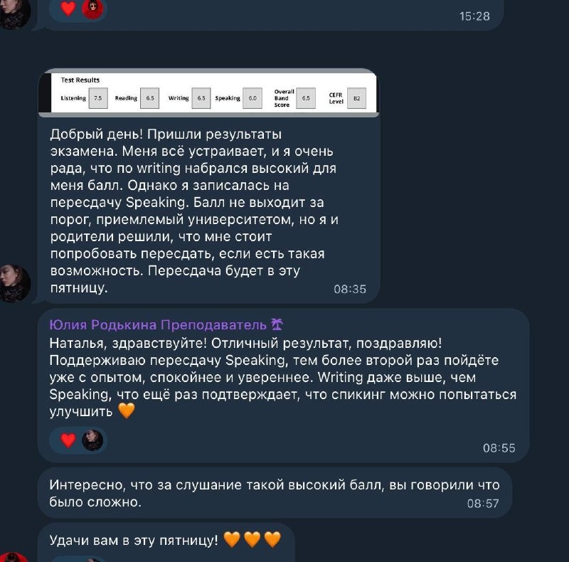 Сегодня снова поговорим про секцию письма, так как у многих она вызывает больше всего трудностей ⬇️ Когда Наталья пришла ко мне на подготовку к IELTS Academic, у нее уже была четкая цель — поступление в европейский университет. И самым важным было то, что для поступления ей нужен был конкретный балл за Writing — 6.5, не меньше И при всей сильной мотивации письменная часть долго оставалась самой сложной 📌Основные трудности были такие: 💕В Task 1 (описание графиков/таблиц) не всегда получалось выделять главное 💕В Task 2 идеи иногда были, но их нужно было учиться раскрывать логично и по критериям экзамена 💕Были повторяющиеся ошибки в грамматике и лексике, которые мешали выйти на нужный балл 💕И, что очень важно, не всегда было понимание, как вообще оценивает проверяющий IELTS Writing. А это одна из главных причин, почему многие долго топчутся на одном балле 📎 Что мы делали в работе над этой секцией: 1. Разбирали структуру каждого типа задания 2. Работали с повторяющимися ошибкам