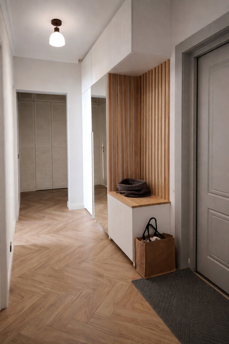 В этом проекте использовано решение с рейками размером 40×20 мм из натурального ясеня. На первый взгляд — лаконично. Но именно в этом и заключается сила такого приёма.