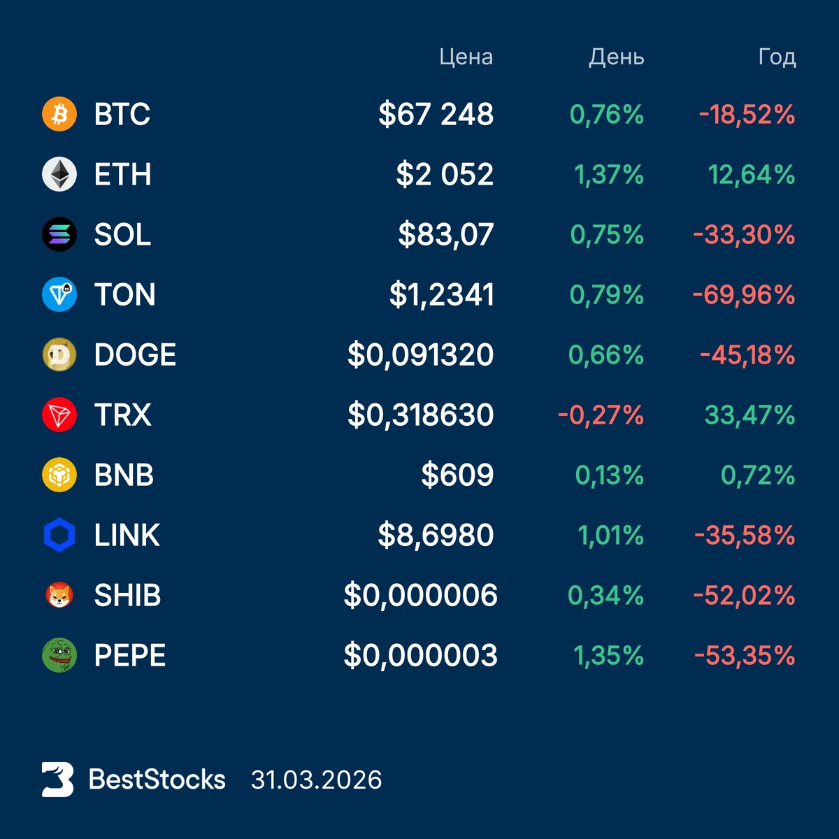 Курсы основных криптовалют: Bitcoin, Etherium, Solana, Toncoin, Dogecoin, TRON, BNB, Chainlink, Pepe, Shiba Inu на текущий момент
