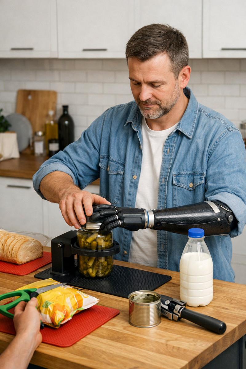 После ампутации человек сталкивается не только с операцией, больницей, документами, протезированием и реабилитацией. Очень быстро приходит другая, не менее важная реальность — обычная повседневная жизнь. Та самая жизнь, в которой нужно открыть бутылку воды, банку с едой, пакет молока, упаковку с продуктами, дверь в подъезд, шкаф на кухне, тюбик пасты, шампунь, контейнер с обедом.