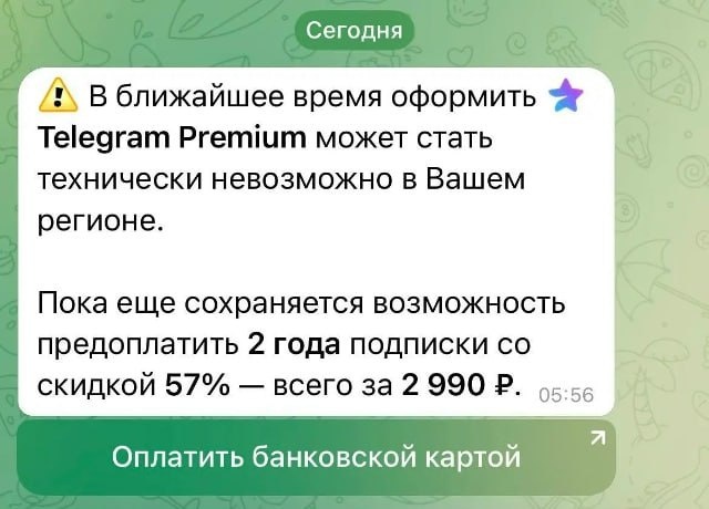 31 марта пользователи Telegram в России начали получать уведомления о том, что оформить подписку Premium можно в последний раз. В рассылке говорится, что в ближайшее время подключение платных функций может стать «технически невозможным» на территории РФ. В качестве альтернативы сервис предлагает оформить подписку сразу на два года по льготной цене. При этом 29 марта в СПЧ заявили о высокой вероятности разблокировки Telegram в России. По данным ведомства, компания может пойти на соглашение с российской стороной, в том числе по вопросам борьбы с экстремистским контентом и каналами, представляющими угрозу национальной безопасности. 📲Юрган в MAX