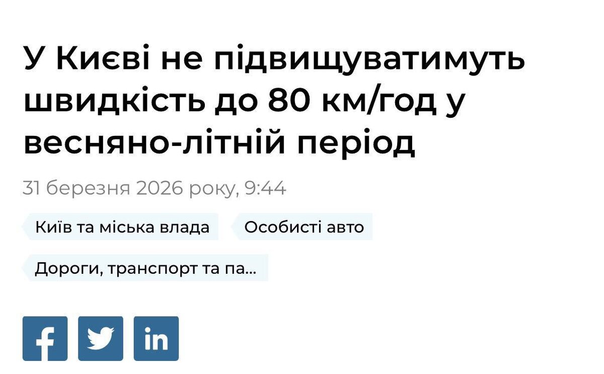 В Киеве в весенне-летний период текущего года не будут вводить традиционное повышение разрешенной скорости движения с 50 до 80 км/ч на отдельных участках дорог. Об этом сообщили в КГГА. Данное решение принято впервые за многие годы. Основной причиной отказа от сезонного увеличения лимита скорости стало плохое состояние дорог. Сайт "Другая Украина" / Telegram / Вконтакте / Центр поддержки Украинцев "Другая Украина" теперь в МАХ