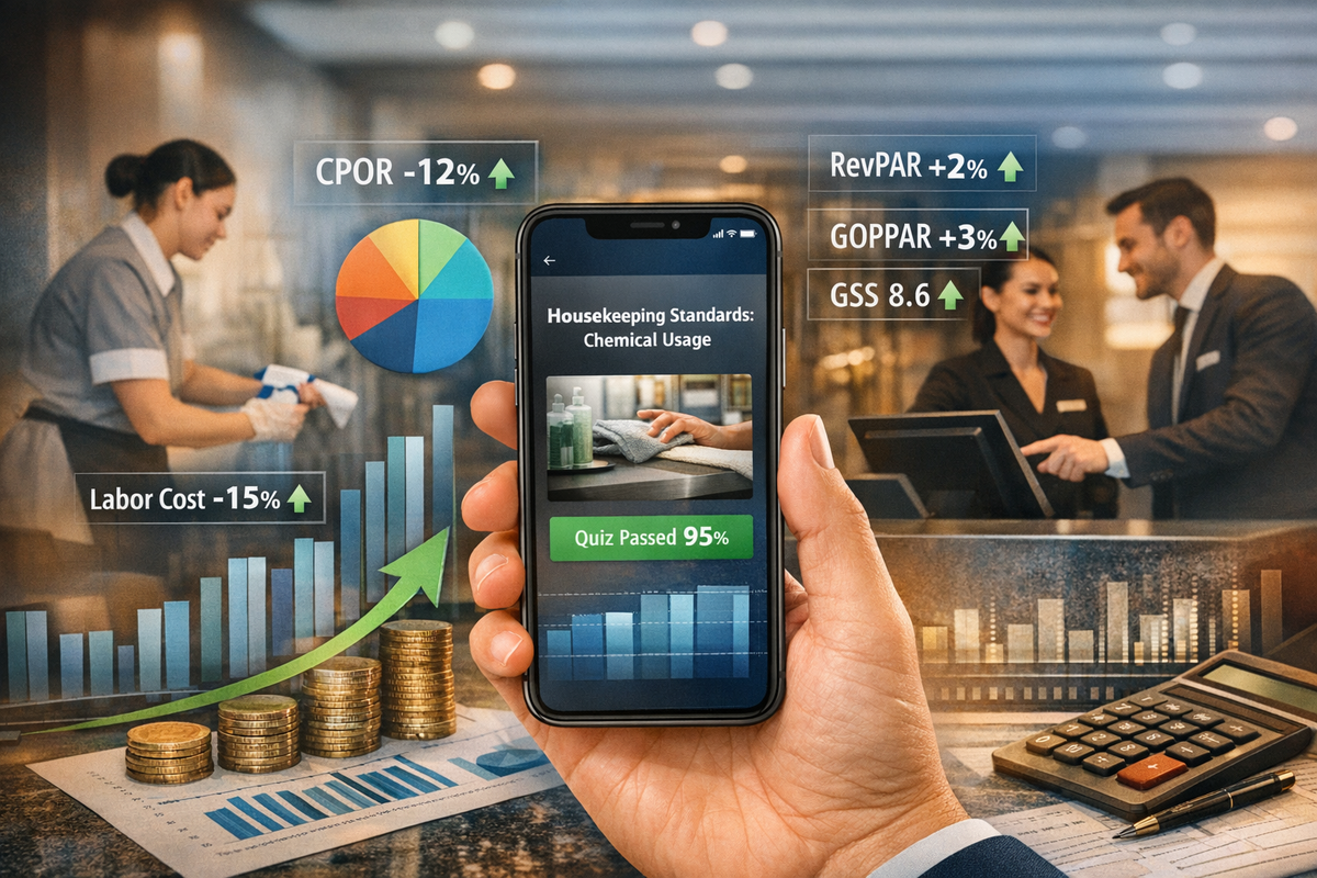 Измеримость. Каждый урок заканчивается проверкой знаний. Менеджер видит: сотрудник X знает стандарт Y с результатом Z%. Это позволяет строить связь которой раньше не было: верифицированная компетенция — поведение — USALI-метрика. Горничная прошедшая урок по нормам расхода химии с оценкой 90%+ с высокой вероятностью применяет это знание — что проверяется через CPOR.