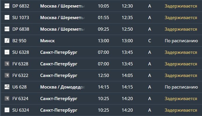 В аэропорту Калининграда «ковер» не вводился, но задержки опять (четвертый раз за неделю) серьезные. Все из-за ограничений в Пулково. Некоторые рейсы, которые должны были отправиться в Большую Россию вчера вечером, вылетели только во вторник утром. А некоторые еще нет: например, FV 6312 «России» опаздывает на 15 часов – самолет покинет Храброво сегодня в 11:20, хотя по графику – вчера в 20:40. Подробнее написали на ТурДоме. @tourdom