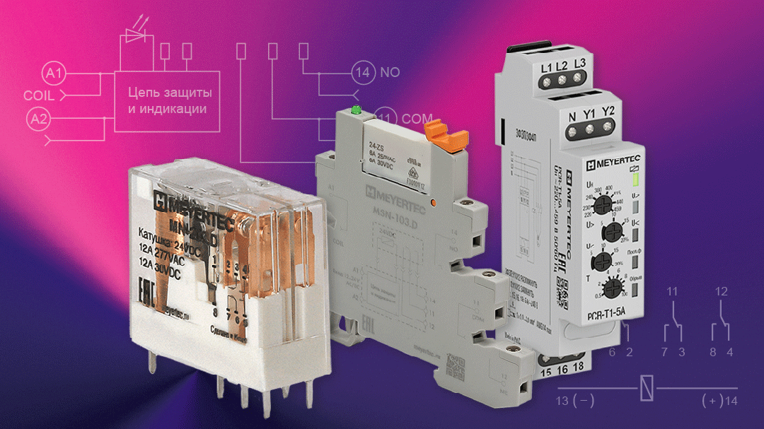 Надежность любого оборудования начинается с выбора качественных компонентов. В промышленной автоматике особую роль играют реле: именно они отвечают за стабильную работу насосных станций, систем вентиляции и целых производственных линий. Их главные задачи — качественная коммутация (замыкание и размыкание электрических цепей), защита сетей и точное согласование сигналов. Рассмотрим три типа устройств MEYERTEC, которые обеспечивают долговечность систем управления: промежуточные, твердотельные и реле контроля фаз. Промежуточные реле MEYERTEC Промежуточные реле — незаменимые элементы при сборке шкафов управления. Они выполняют сразу несколько критических функций: создают гальваническую развязку (физическое разделение цепей, которое исключает протекание тока между ними для защиты чувствительной электроники от высокого напряжения), усиливают слаботочные сигналы контроллера для управления мощной нагрузкой и обеспечивают размножение сигналов с одного выхода программируемого логического контролл