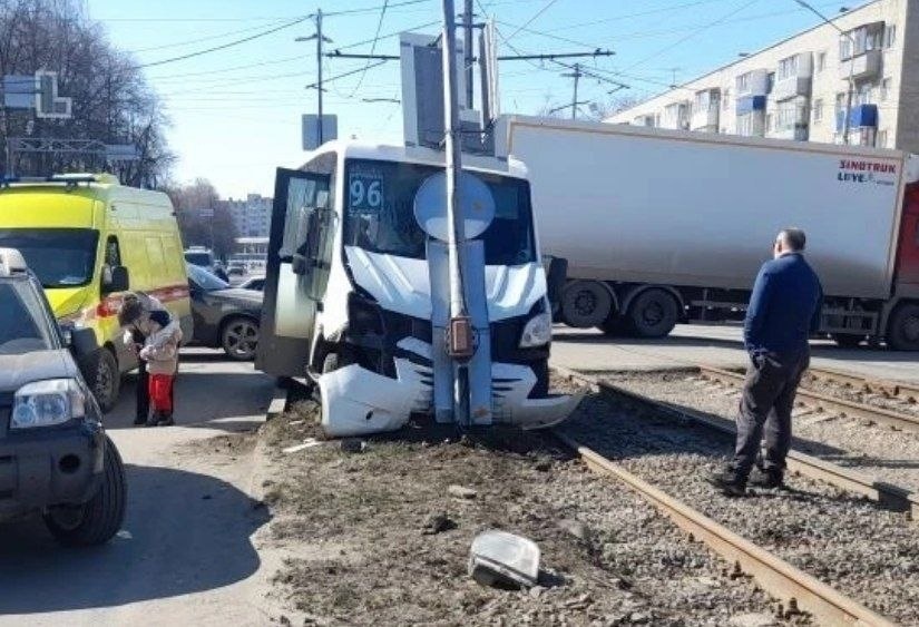 Из-за аварии с участием микроавтобуса, следовавшего по маршруту №96, пришлось приостановить движение трамваев в сторону центра. Маршрутка врезалась в опору контактной сети. Поперёк трамвайных путей встала фура. На место прибыла карета скорой помощи. Судя по фото, одним из участников ДТП стал ребёнок. Трамваи №15 и №22 едут в объезд через остановку «Гидроаппарат». Фото: МУП «Ульяновскэлектротранс»