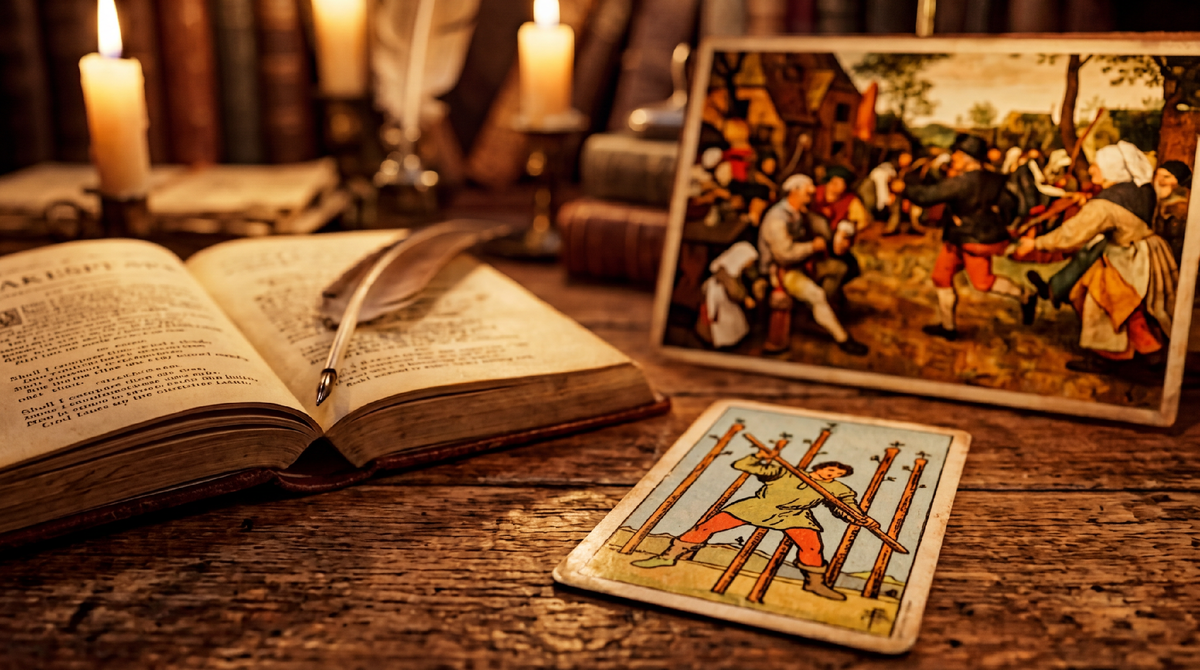 Большинство учебников пишут про 7 Жезлов одну строчку: «защищай свою позицию». Всё. На этом заканчивается. Но если смотреть внимательно на карту Памелы Колман Смит, то обнаруживаешь целый театр. Давайте разберём её послойно. Мужчина стоит на вершине холма и отбивается одним жезлом от шести жезлов, поднимающихся снизу. Важная деталь: тех, кто держит эти шесть жезлов, не видно. Нет ни лиц, ни тел противников. Только жезлы. Позади мужчины — открытое небо. Перед ним — угроза. Но он выше. Это главный секрет карты, который прячут почти все учебники. Исследователи Маркус Катц и Тали Гудвин в своей книге «Секреты Таро Уэйта-Смит» установили: мужчина на карте — это Петруччо из пьесы Шекспира «Укрощение строптивой». В третьем акте этой пьесы Петруччо намеренно приходит на свадьбу в совершенно нелепом виде: старый камзол, ржавая сломанная шпага и ботинки: один застёгнут пряжкой, другой зашнурован. Памела специально нарисовала именно эти детали: один ботинок с пряжкой, другой со шнуровкой (и шнуро