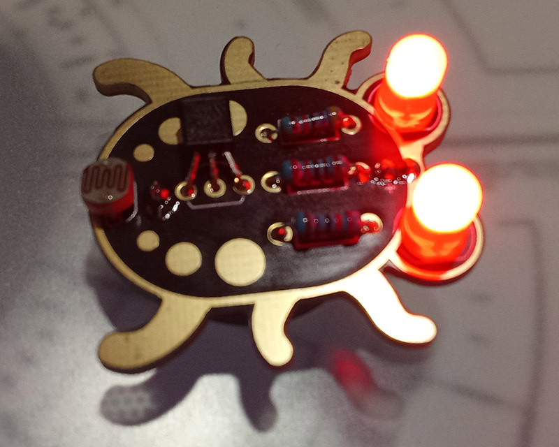 Набор для самостоятельной сборки жука Weevil LED. Когда ожидание по картинке лучше, чем результат Купить можно тут Набор очень простой Плата, 3 резистора, светорезистор, 2 светодиода, транзистор 2n3904, отсек под батарейку Припаиваем мелкие компоненты В конце отсек для батарейки Вставляем батарейку CR2032, отдельно купленную Всё. Жучок готов Тест Светодиоды в наборе служат глазами робота-жука, которые автоматически загораются при наступлении темноты Лампочки светятся. Наводим фонарик – лампочки тухнут. Убираем – светятся. Наводим не светятся. И … Бесполезная штука за 150 рублей, сажающая батарейку, которую сложно достать. Настоящая первоапрельская шутка