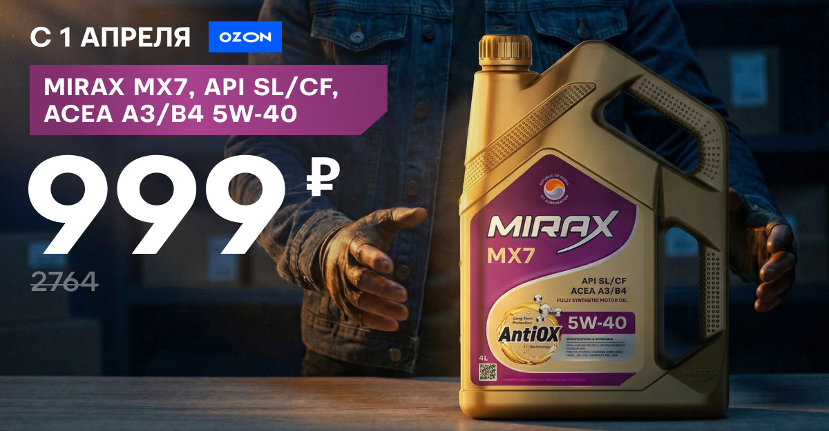 В наш век дезинформации 1 апреля немного потеряло свой шарм, но мы в Mirax очень любим хорошие розыгрыши. Добавляйте наш продукт Mirax MX7 5W-40 A3/B4 в корзину на OZON и в ночь на первое апреля вас ждет сюрприз – цена превратится в 999 рублей за канистру 4 литра. Как вам такое? Немного расскажем про продут. Mirax MX7 5W-40 A3/B4 – универсальное синтетическое моторное масло, которое можно использовать в широком спектре автомобилей азиатского, европейского и российского производства. Пройдемся по спецификациям: — API SL – продукт можно использовать в большинстве японских, корейских и американских автомобилей выпуска в возрасте от 10 до 20 лет (более свежим автомобилям, как правило, рекомендованы масла класса API SM или SN) — АСЕА А3/В4 – масло отлично подойдет подавляющему большинству европейских автомобилей: как бензиновых, так и дизельных без DPF-систем. — VW 502 00/505 00 – продукт можно смело применять в бензиновых автомобилях концерна Volkswagen AG, которым инструкцией рекомендован