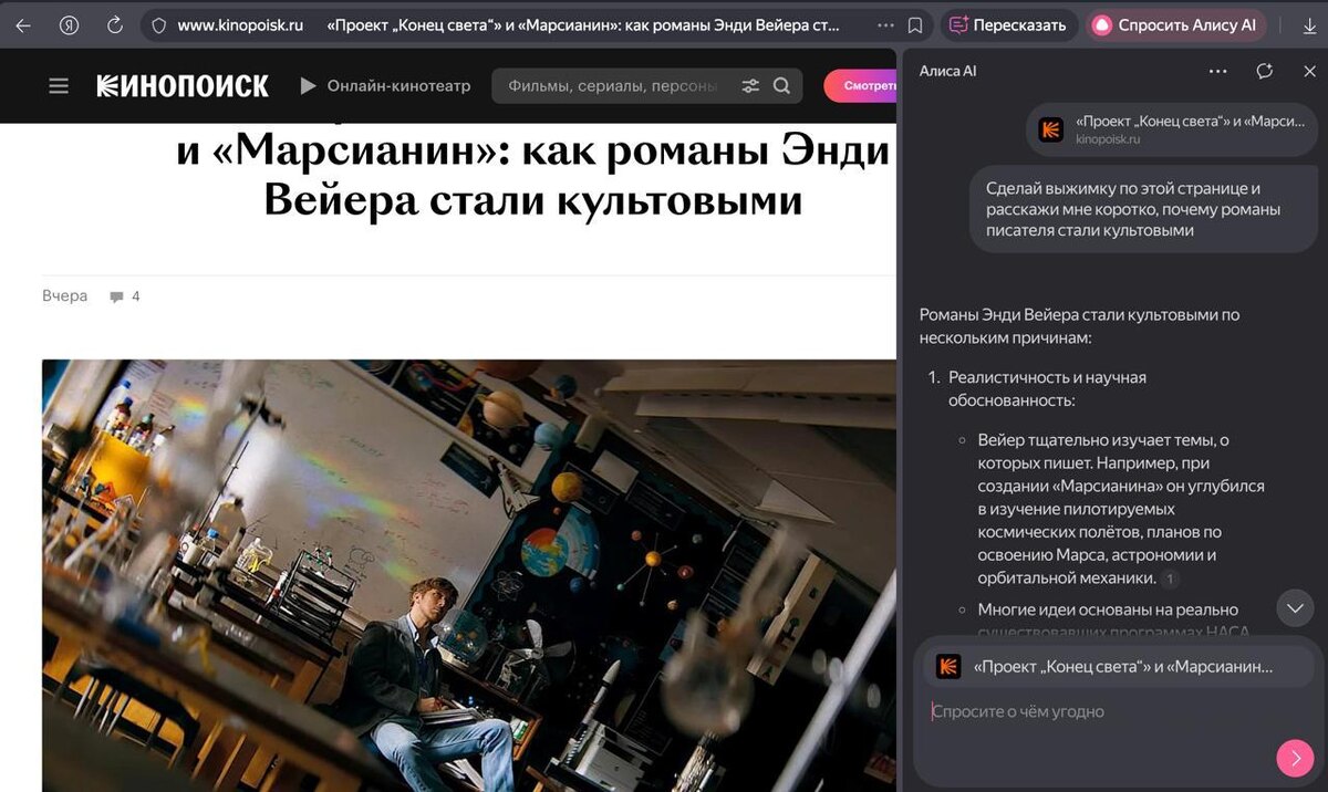 ! ИИ помогает разобраться с информацией на сайте, видео и документах, а также отвечает на любые вопросы. Алиса AI вытаскивает суть и собирает ответ Например, открыли статью и сразу попросили ИИ выделить главное — без лишних кликов 🔍 Просто спрашивайте и получайте быстрые ответы! 🚀 Новое для тебя 👉@mikenimoff