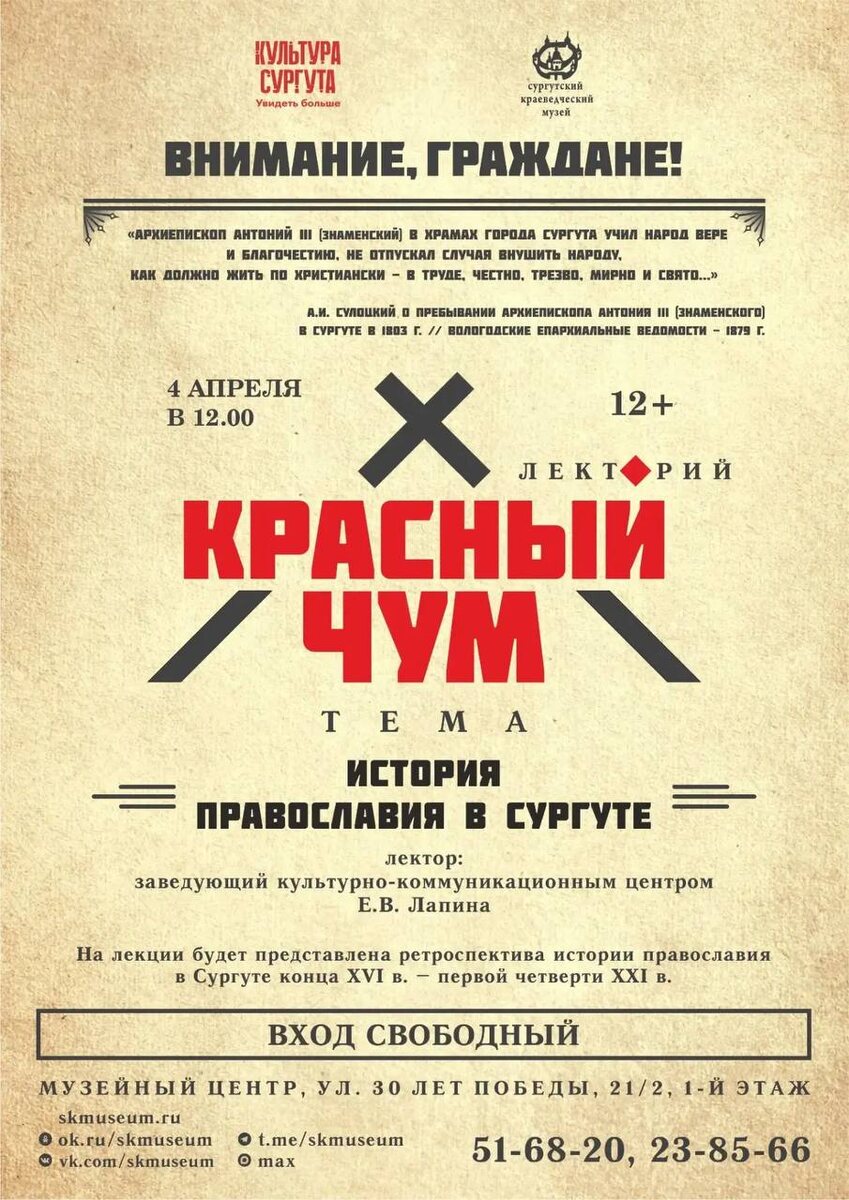 » Встреча состоится 4 апреля в 12:00 в Музейном центре в рамках просветительского проекта «Красный чум». Заведующий культурно-коммуникативного центра музея Елена Лапина представит ретроспективу истории православия в Сургуте с момента основания первой церкви в 1594 году до его возрождения в конце XX – начале XXI века. Участники лектория узнают интересные факты о строительстве храмов в Сургуте, служении священников в Сибири, об особенностях общественной деятельности приходов, о годах забвения веры и периоде возрождения православия на рубеже веков. Вход свободный. Мы в Max | ВК | ОК | Телеграм | Официальный портал | Дзен