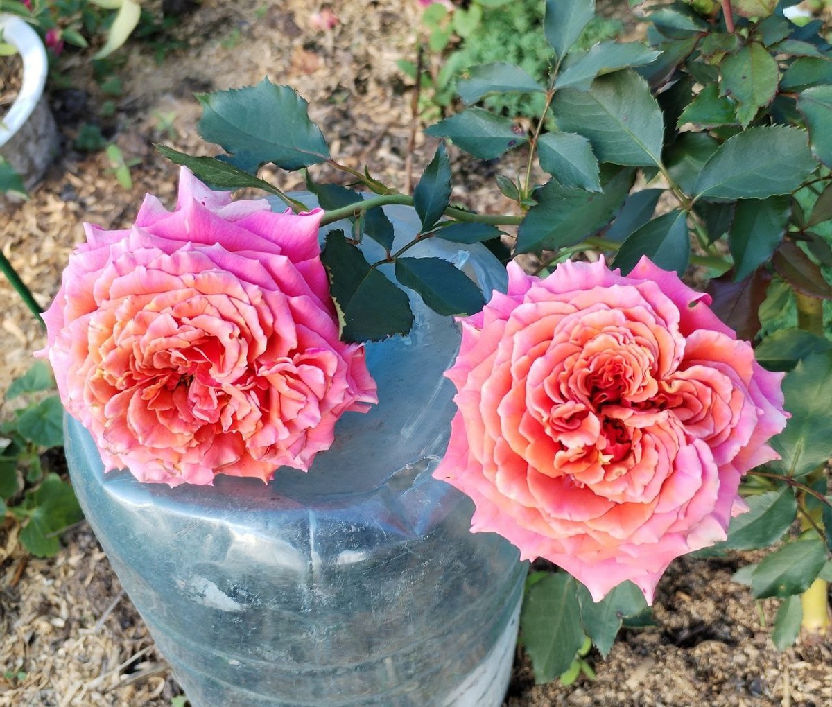 Вместо рыхления — тоже мульча. У молодой розы корни близко к поверхности, их легко повредить тяпкой. Под слоем мульчи земля остаётся рыхлой сама по себе.