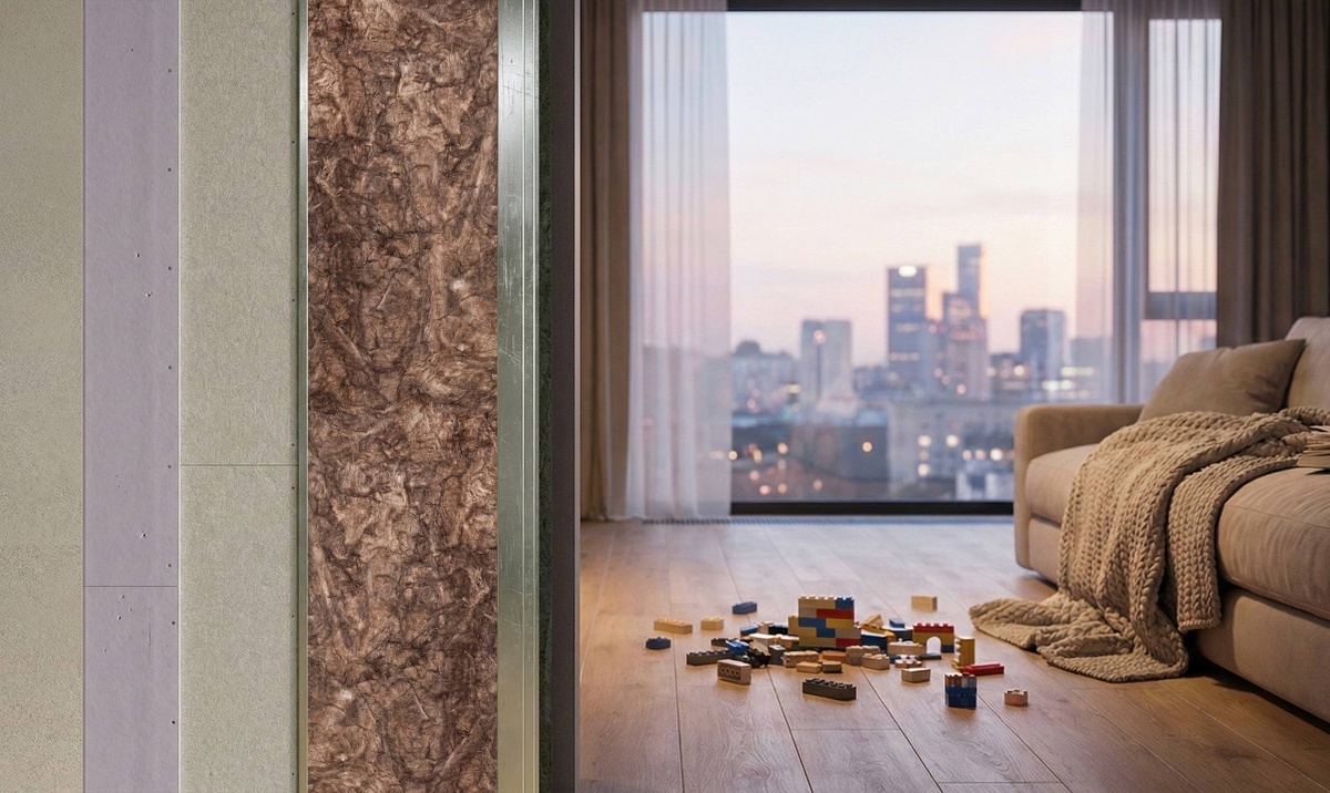 Шуманет-ЭКО S и обычная минвата – материалы одного класса: волокнистые звукопоглотители, однако есть ряд отличий. Важно понимать: сам по себе такой материал не «делает» звукоизоляцию, а работает как часть системы. Сравним: С обычной минватой связан ряд типовых проблем: пыль при резке, ломкое волокно – как следствие, сложный монтаж. В итоге страдает геометрия – материал может неравномерно встать в каркас, появляются щели, а это прямые потери по эффективности. Плюс разброс характеристик: плотность и упругость могут отличаться, и результат сильно зависит от подбора и аккуратности монтажа. Плиты Шуманет-ЭКО S, разработанные совместно с Knauf, имеют высокий коэффицент звукопоглощения за счет длинных и тонких волокон, а также ряд пользовательских и технических преимуществ. Технология ECOSE (без фенол-формальдегидных смол) с безопасным клеящим связующим из растительных компонентов делает материал экологичным и негорючим. При этом он меньше пылит, проще режется, ровнее заполняет каркас и лу
