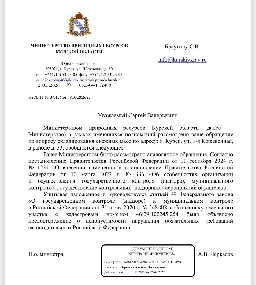 Министерство природных ресурсов Курской области направило следующие ответы на наши обращения