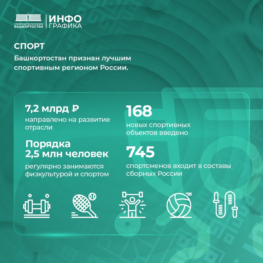 Башкортостан вновь признан лучшим спортивным регионом России. На развитие отрасли направили из бюджета в прошлом году 7,2 млрд рублей (в том числе из из федерального бюджета привлекли порядка 600 млн рублей, а в этом году смогли увеличить федеральное финансирование до более чем 1 млрд рублей). В списке ключевых достижений по данному направлению за 2025 год ⬇️ 🔹 2,5 млн человек (64%) регулярно занимаются физкультурой и спортом, 🔹 введено 168 новых спортивных объектов, их общее число достигло 13,5 тыс., 🔹 745 спортсменов из Башкортостана входят в составы сборных России (максимум за пять лет), завоевано 3654 медали, 🔹 305 участников СВО на постоянной основе занимаются адаптивным спортом, с их участием созданы следж-хоккейная команда «Булат», команда по волейболу сидя и сборная ветеранов по 13 видам спорта.