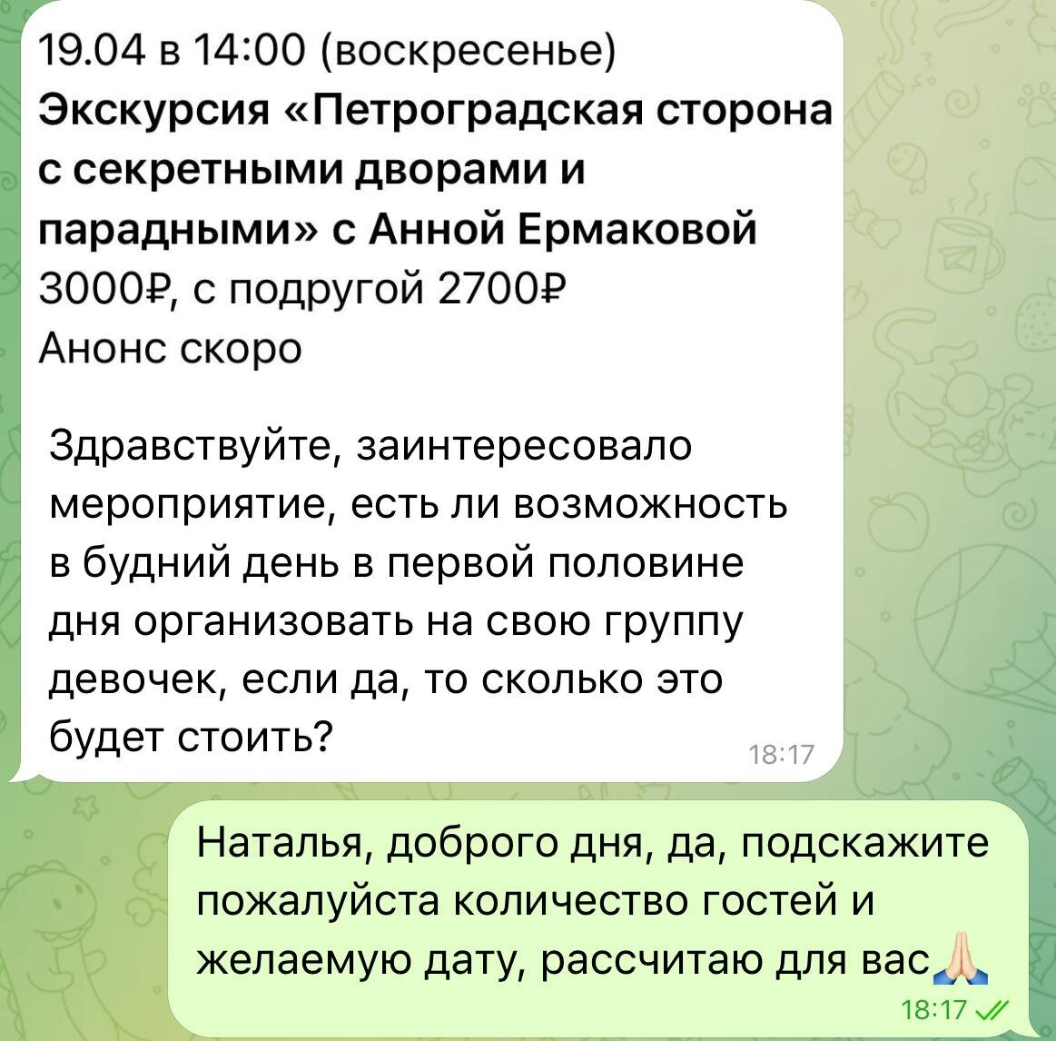 удобную дату для встречи, сейчас все чаще мы проводим такие частные заказы и очень рады,что вы обращайтесь к нам🙏🏻 Также вы можете заказать у нас корпоративы для вашего бизнеса, оплаты проводим через счет🙏🏻 Запись через @devishnik_spb