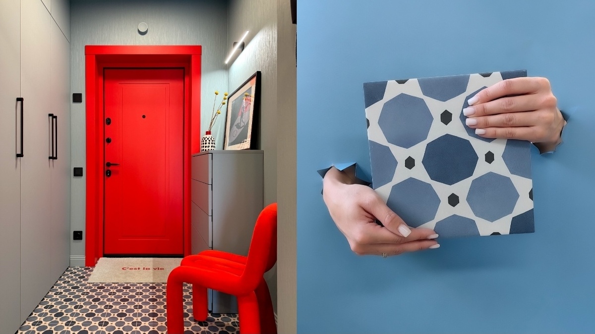 Прихожая — первое пространство, которое встречает нас и гостей при входе в дом. Она должна быть не только красивой, но и функциональной: выдерживать высокую проходимость, быть устойчивой к загрязнениям и простой в уходе. Плитка с орнаментом идеально отвечает этим требованиям, сочетая эстетику и практичность. Разберёмся, почему это решение стоит рассмотреть для вашего интерьера. Почему именно плитка? Ключевые преимущества плитки для прихожей: Орнамент на плитке превращает обычное напольное или настенное покрытие в декоративный элемент. Прихожая с узорной плиткой выглядит: Давайте на реальном примере разберем дизайн прихожей, в которой пол выложен плиткой с орнаментом. Интерьер этой прихожей отличается смелым и современным дизайном с выразительными акцентами. Ключевой элемент — ярко-красная входная дверь. Такой цветовой акцент сразу привлекает внимание и задаёт динамичный тон всему пространству. Стены выполнены в спокойном серо-голубом оттенке с лёгкой текстурой, что создаёт нейтральный