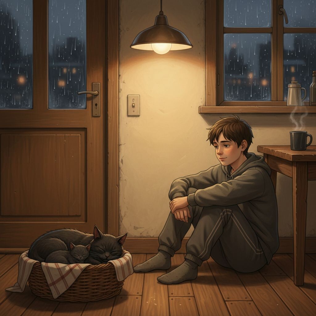 Артём снял с себя толстовку, подстелил внутрь картонки, аккуратно завернул котёнка, потом, не давая себе времени передумать, взял коробку на руки. Кошка вскочила, судорожно мяукнула и, пошатываясь, пошла за ним следом — по лужам, по гулкому двору, по лестнице, не отставая ни на шаг.