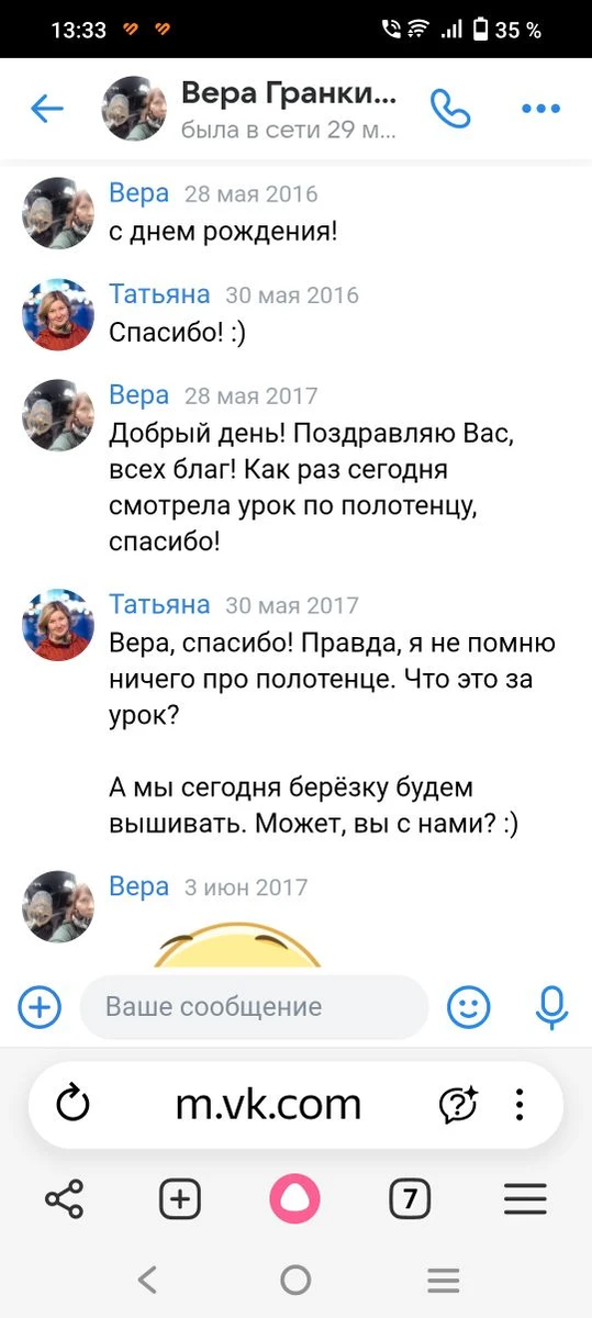 Я же скромная - вот сИстра моя jam не даст умолчать этот факт. И моя справедливая скромность велит отчитаться: я - прекрасный учитель. И великолепная ведущая замечательной телепрограммы. Даже не спорьте, всё равно не слушаю. Доказать? Да леХко! Если было бы иначе, вспоминали бы про мои конкретные программы годы спустя?! А про эти - вспоминают. Какие? Ниже всё покажу - и картинки, конечно. Вот скриншот переписки с Верой Гранкиной. Обратите внимание на сообщение от 28 мая 2017 года: Здесь есть некая загадка: "урок по полотенцу". Как видите, я сама не поняла, о чём речь, хи-хи. А вот - скрин свежий, от 5 марта 2026 года: И вот тут интрига раскрыта: речь идёт о строчевой вышивке "горох". О программе, которая вышла в эфир в феврале 2015 года - 11 лет назад. 11 лет! И вот сегодня я получила новое письмо - о ней же, о строчевой вышивке! Скриншоты - это доказательства, чтобы без лишних слов. Но подробности на них не рассмотреть. А полюбоваться произведениями золотых рук хочется! Поэтому сейч