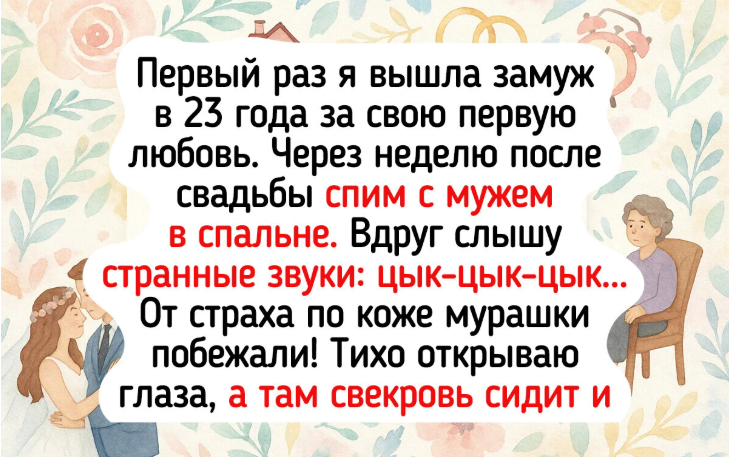 - Первый раз я вышла замуж в 23 года за свою первую детскую любовь. Сыграли свадьбу. Через неделю после свадьбы спим, значит, в спальне с мужем. И слышу ночью странные звуки: цык-цык-цык.... От страха по коже мурашки побежали! Даже не могла понять, откуда такие звуки. Тихо открываю глаза, а там сидит свекровь и стрижет ногти своему сыночку. @ dinara.nasip