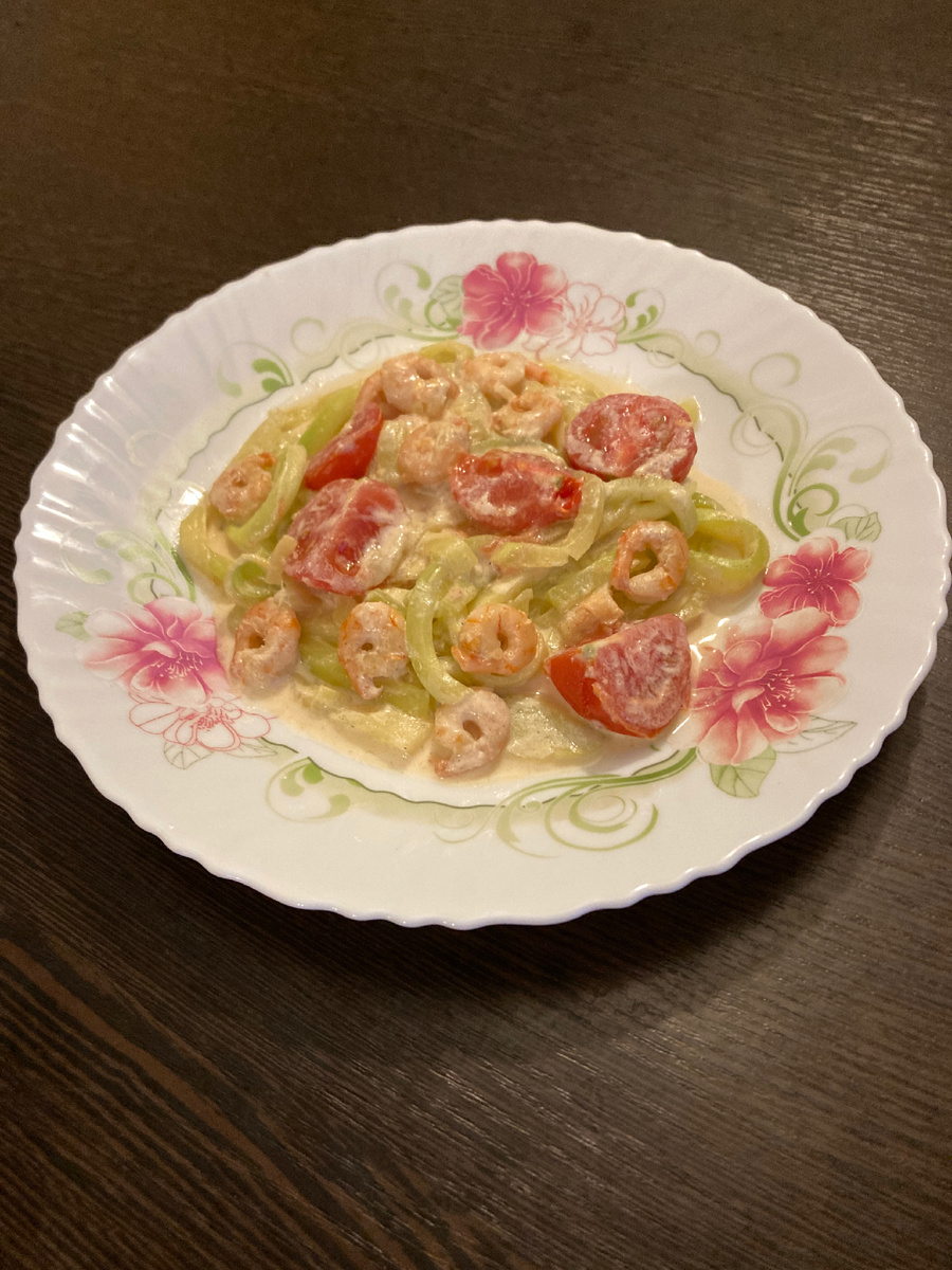 обжариваем креветки 5 минут. Добавляем кабачок, тушим ещё 10 минут. Добавляем соль и