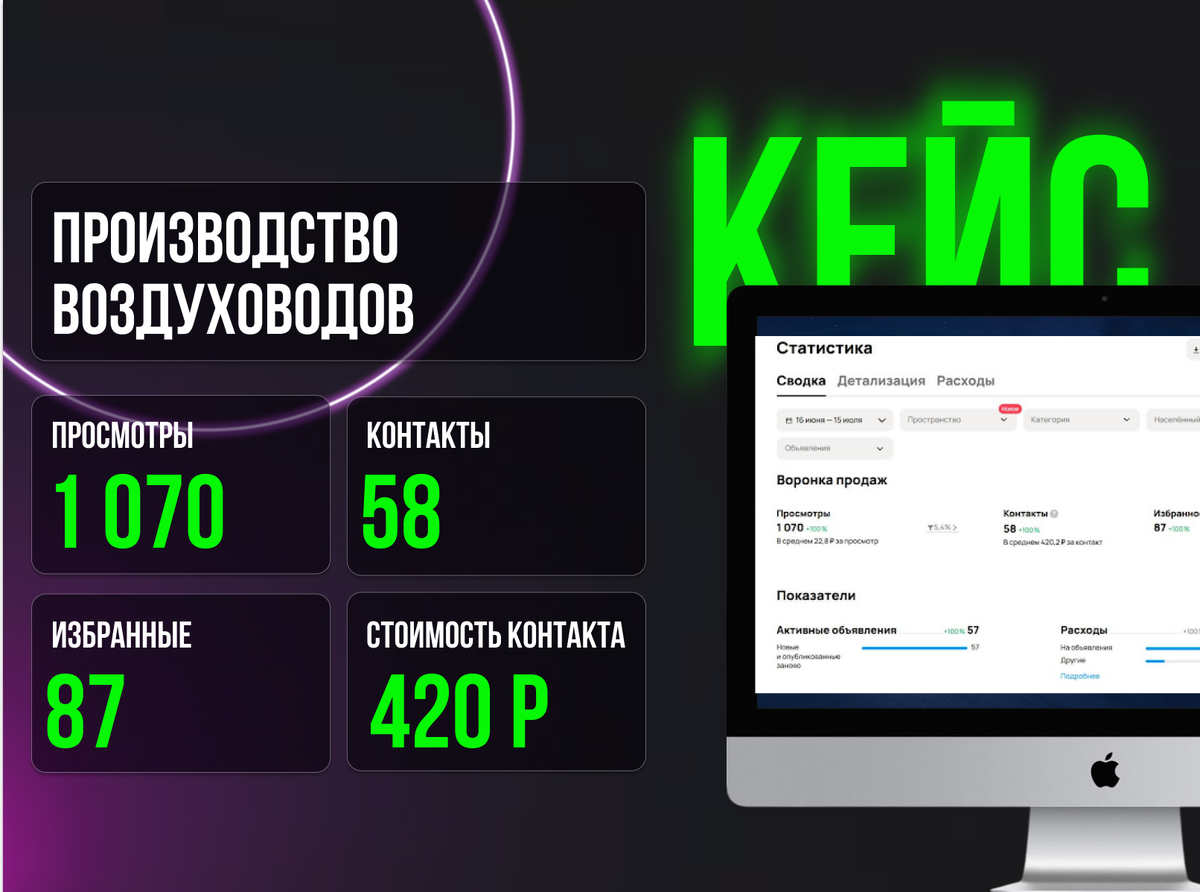 Производство воздуховодов в Омске вышло с нуля до 58 целевых звонков за месяц при бюджете 24 574 ₽. Что не работало, что поменяли и почему заказы расписаны на месяцы вперёд. Как производственная компания в Омске получила 58 заявок на Авито за месяц с бюджетом 25 тысяч Полный ноль: ни объявлений, ни просмотров, ни звонков Компания уже восемь лет делает прямоугольные и круглые воздуховоды в Омске — на заказ и со склада. Средний чек от 5 до 50 тысяч рублей. Обращаются в основном местные: хозяева кафе, офисов, цехов. Им нужна не просто труба, а подходящий размер, нормальный металл и адекватная цена. Когда пришли к нам — на Авито тишина. Ни одного объявления, ни одного взгляда, ни одного сообщения. Клиент был уверен: выложишь товар — и пойдут заказы. На деле без понимания, что ищут люди, в какое время и по каким словам, объявление просто висит мёртвым грузом. Ограничения, с которыми работали В этой нише люди редко ищут просто воздуховод. Чаще звонят, когда нужна вся услуга разом: изготови