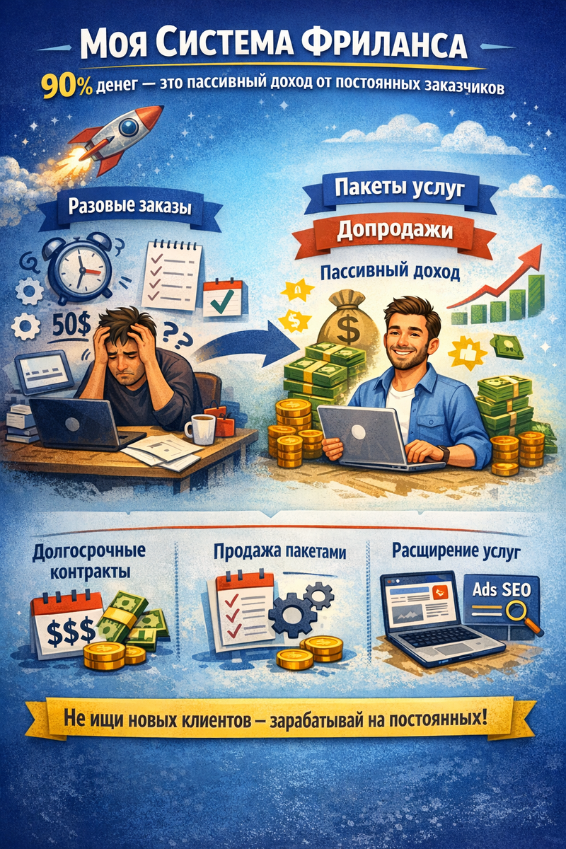 90% денег — это пассивный доход от постоянных заказчиков Большинство фрилансеров застревают на одном и том же уровне. Они постоянно ищут клиентов.