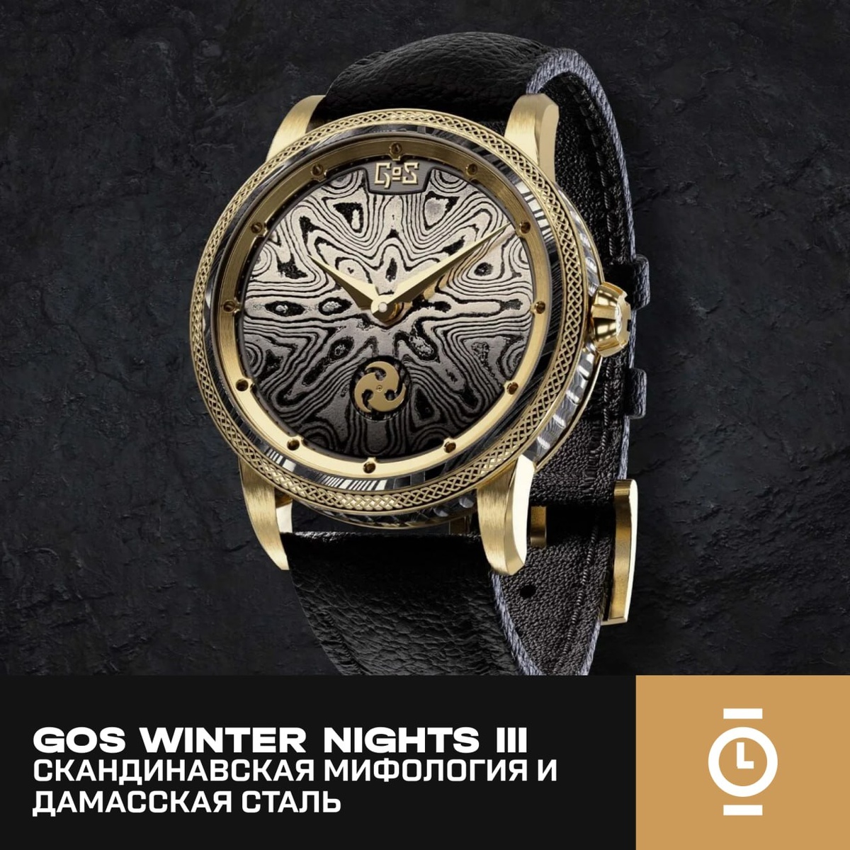 #обзор_WD Шведское независимое ателье GoS продолжает развивать тему дамасской стали, представив новую модель Winter Nights III. Новинка переосмысливает оригинальные Vinternätter 2013 года, сочетая тёмную нержавеющую дамасскую сталь с элементами из 18-каратного шведского золота. Корпус диаметром 41,5 мм выполнен с центральным кольцом из дамасской стали, прошедшей фирменную обработку с закреплённой патиной. Это не просто декоративное покрытие — структура интегрирована в металл, обеспечивая долговечность и устойчивость к износу. Безель, задняя крышка и ушки изготовлены из 18k золота, создавая выразительный контраст. Толщина варьируется от 12,1 мм в центре до 8 мм по краям, водозащита — 50 метров, сапфировые стёкла установлены с обеих сторон. Циферблат выкован мастером Конни Перссоном из дамасской стали с характерным узором «wildflower». В ателье GoS он проходит травление, полировку и оксидирование, благодаря чему каждый экземпляр уникален. Разметка выполнена в два уровня: антрацитовая
