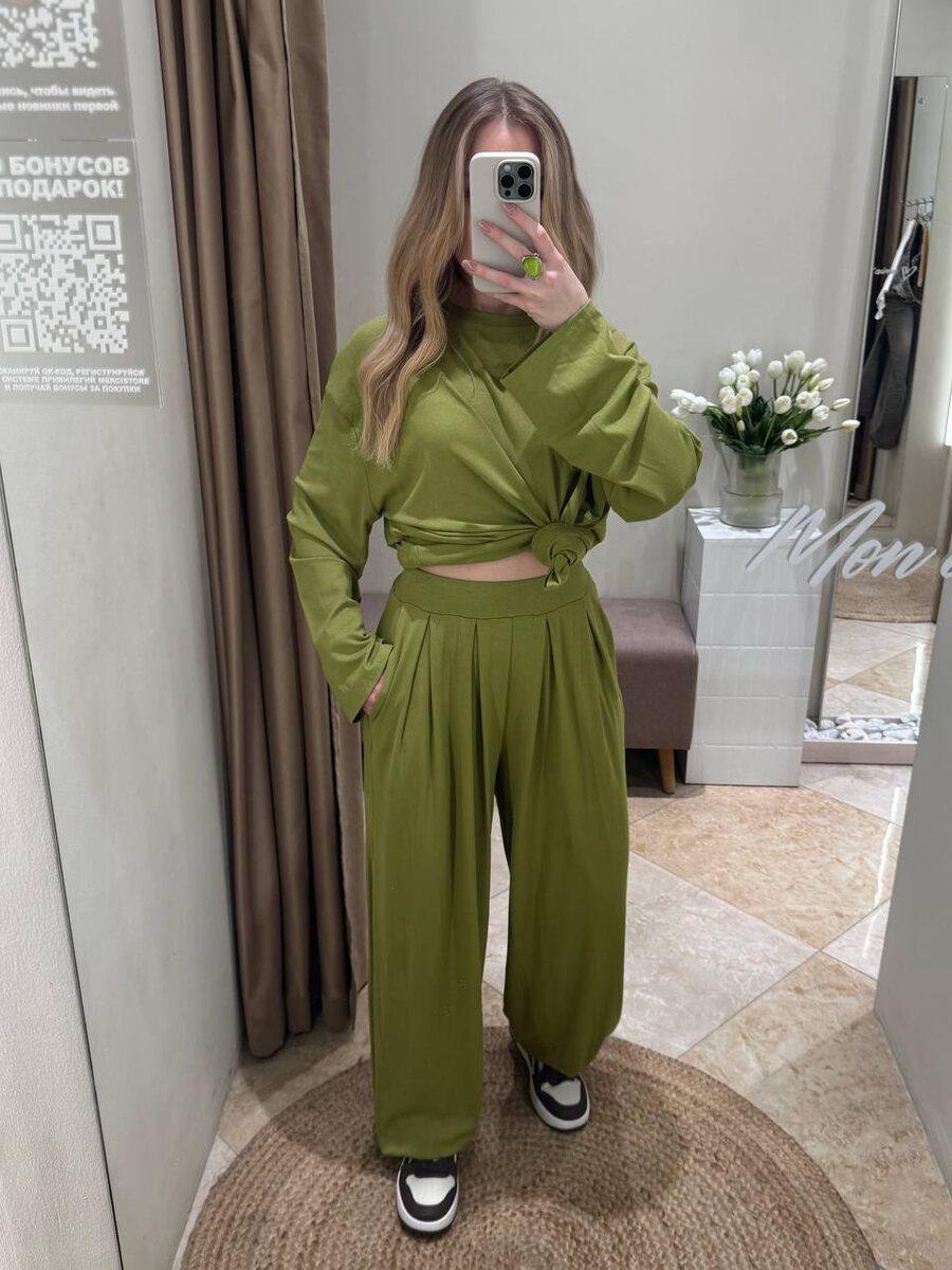 💚 Свободные брюки с мягкой посадкой, удлинённый лонгслив из струящейся ткани, который можно носить по-разному: оставить свободным или завязать, как на фото, чтобы подчеркнуть силуэт. Получается универсальный образ на каждый день: — с кедами для более расслабленной стилизации — с обувью на каблуке, если хочется сделать его более женственным и собранным В наличии в нескольких оттенках: шоколад, бежевый и лаймовый. Размер единый. Ждём вас в MERCISTORE 📍Вологда, ТРЦ Мармелад, 2 этаж ✈️ Доставка по РФ